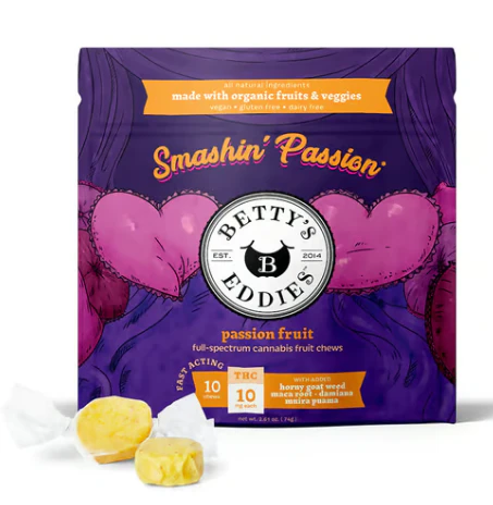 Take Betty’s into the bedroom with Smashin' Passion! Infused with a blend of full-spectrum cannabis and natural aphrodisiacs, including horny goat weed, maca root, damiana & muira puama, these passion fruit chews are a sweet and romantic treat for you and yours. Chews passion, get pleasure!