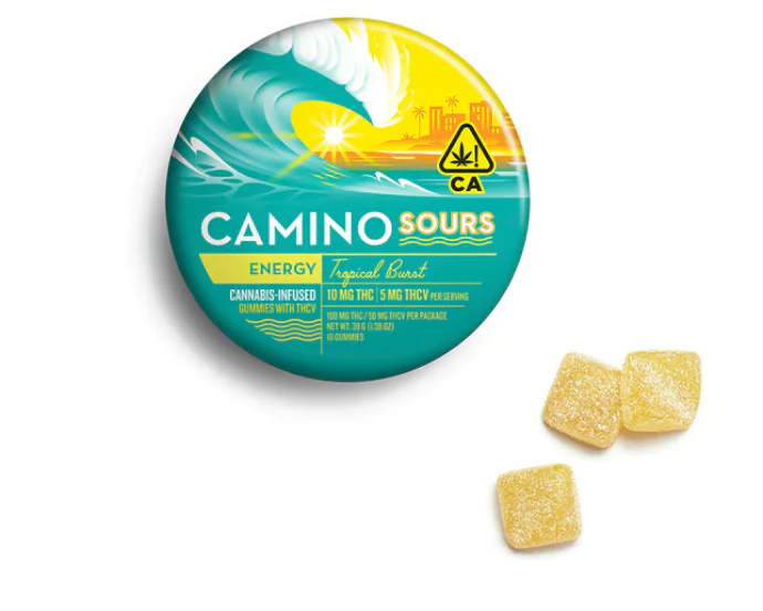 With Camino Sours Tropical Burst Energy gummies, you can enjoy an exhilarating experience with 10MG THC and 5MG THCV. 10mg THC and 5mg THCV per piece | 100mg THC and 50mg THCV total in 10 pieces.