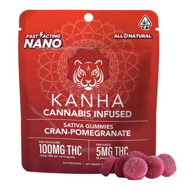 KANHA NANO Cran-Pomegranate Punch Sativa Gummies10 pieces x 10mg/gummy = 100mg/bagOld world meets new when cranberries, one of North America's few native fruits, meets pomegranates, a Mediterranean berry dating back to ancient times, for a sweet Cran-Pomegranate Punch. Made with the finest sativa oil and aromatic terpenes, these gummies enjoy better absorption and rapid effects thanks to our exclusive NANO technology for reducing cannabinoid sizes. KANHA, the first brand to introduce fast-acting effects, remains the best with NANO gummies.Instructions: Eat 1 gummy. Onset starts around 5-15 minutes. Wait 60 minutes for full effect. Keep in a cool, dry place. Avoid temperatures over 75°F.Ingredients: Tapioca Syrup, Cane Sugar, Water, Gelatin, Agar, Locust Bean Gum, Carnauba Wax, Citric Acid, Natural Flavor, Natural Color, VESIsorb Nanotech, Cannabis Oil, and Natural Sativa Terpenes.
