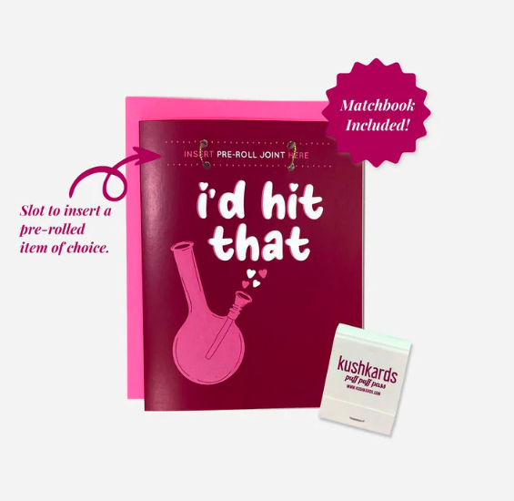 Our "I'd Hit That" greeting card merges humor with the laid-back vibe of cannabis culture, making it an irresistible choice for your loved one. The deep plum backdrop and whimsical bong illustration cater to a fun-loving audience, while the playful phrase captures a lighthearted, communal sentiment.