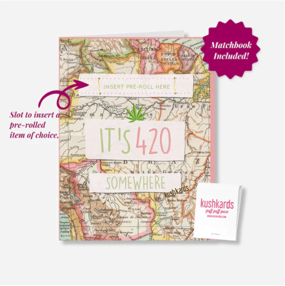 It's 420 somewhere should be just as acceptable as it's 5 O'Clock Somewhere! For the person who always lights up at 4:20 when they look at the clock, our "It's 420 Somewhere" Cannabis Greeting Card will surely make their day. Featuring a part of the World Map as the background, this KushKard is bound to send you to "Happy-ville". Get it with or without the matching one hitter, and add your own "bud" to toke up with your favorite Bud at 4:20, or whatever time it is, we don't judge...
