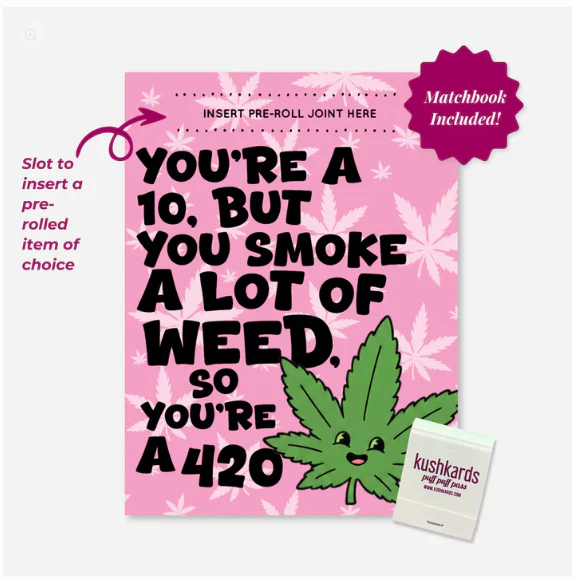 The 2026 Limited Edition “You’re a 10, But You Smoke a Lot of Weed So You Are a 420” KushKard is a bold, funny cannabis greeting card that turns a viral phrase into the ultimate 420 compliment. Featuring chunky black lettering, a playful smiling cannabis leaf, and a pink background filled with subtle weed icons, this card delivers instant laughs and love.