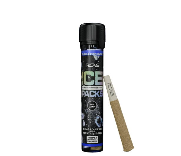 Rove’s King Louis XIII Infused Pre-Roll elevates a classic Indica strain with a dual infusion of THCA diamonds and solventless ice hash rosin for an exceptionally potent and flavorful smoke. Crafted for seasoned consumers, this luxurious pre-roll merges rich tradition with modern extraction, delivering a bold, couch-locking experience with every hit.