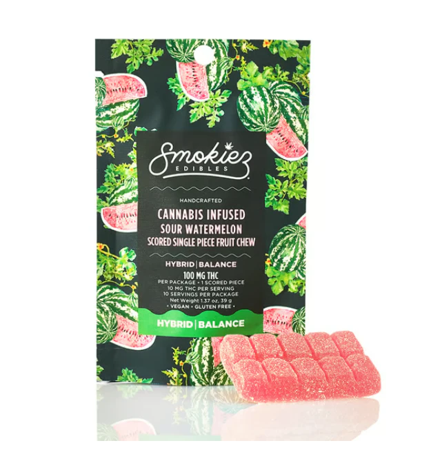 Scored for easy dosing! Smokiez Sour Watermelon Hybrid Fruit Chews are NOT YOUR AVERAGE FRUIT CHEWS™ ;) These fruit chews taste like a tart and juicy watermelon, with a pleasant balance of fruity and citrusy notes. These delicious fruit chews are a tasty and discreet way for you to medicate! They are also Vegan, Gluten Free, Dairy-Free, and contain NO High Fructose Corn Syrup. Each section of our mouth watering fruit chews contain 10 mg of THC, and made with our high clarity cannabis distillate for great taste. There is 1 piece per package with 100 mg active THC per package.