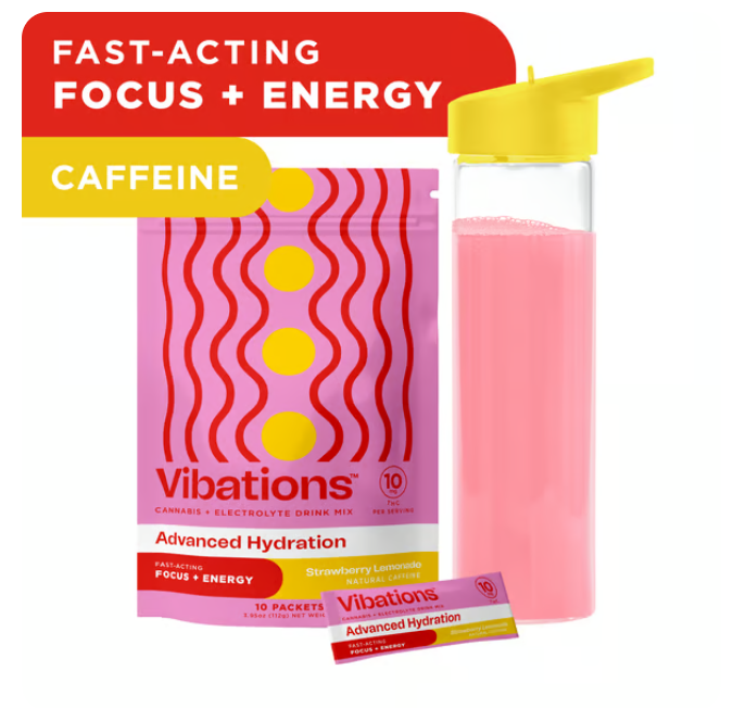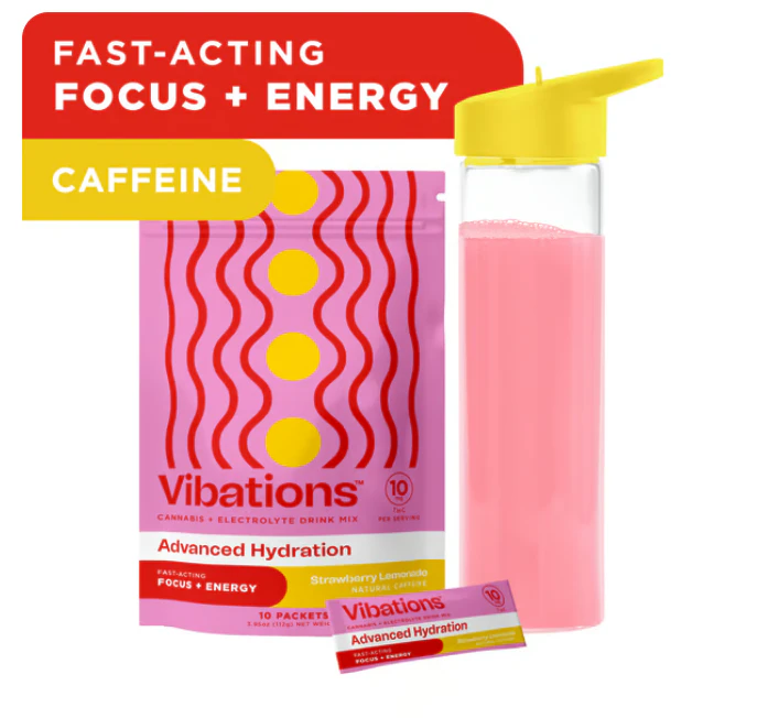 Focus and energize your day with Vibations: Advanced Hydration. Our great-tasting cannabis + electrolyte drink mix is infused with fast-acting, full-spectrum cannabis, optimized cannabinoids, and natural ingredients so you can vibe your way into your best day.